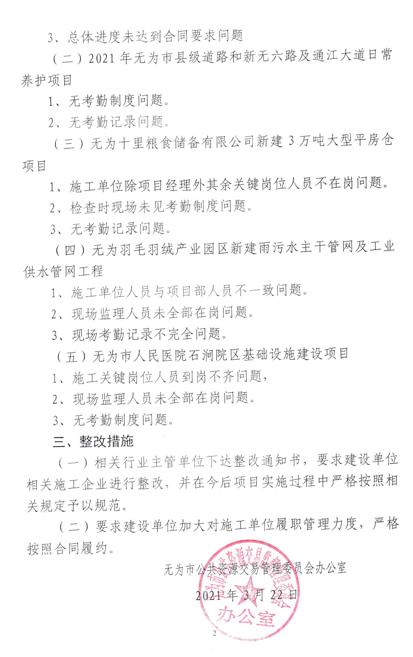关于2021年第一季度无为市政府投资工程建设项目标后联合执法检查情况的通报