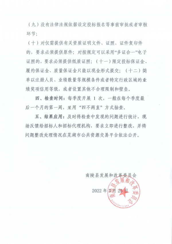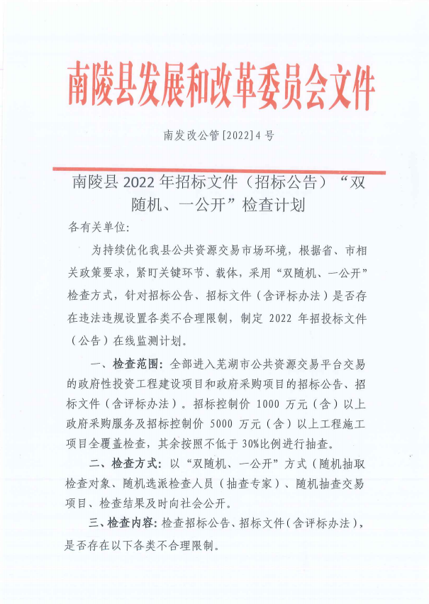 南陵县2022年招标文件(招标公告)“双随机、一公开”检查计划