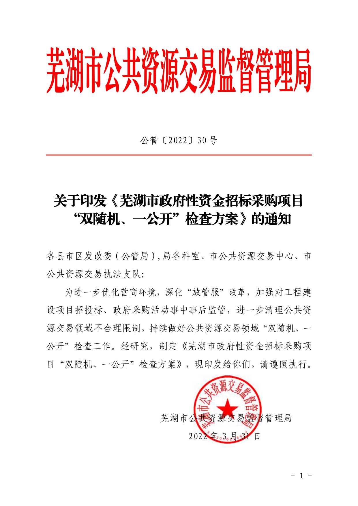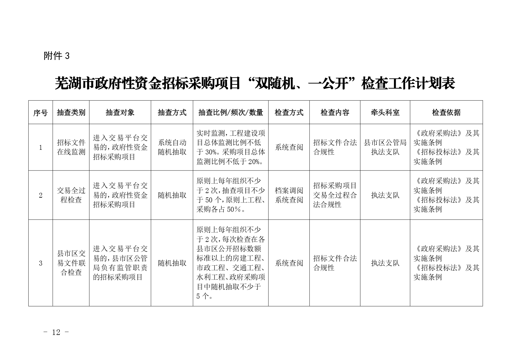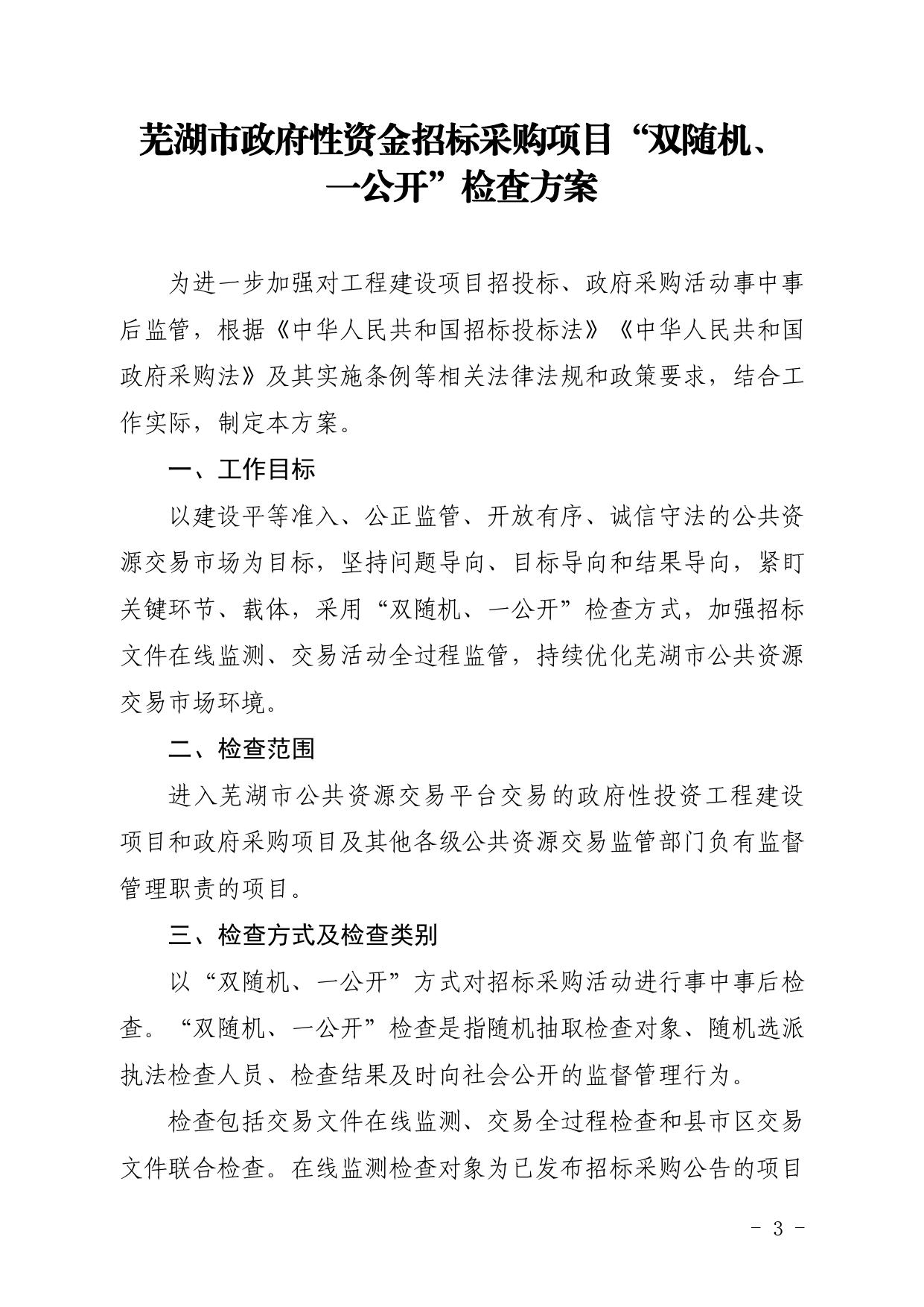 关于印发《芜湖市政府性资金招标采购项目“双随机、一公开”检查方案》的通知