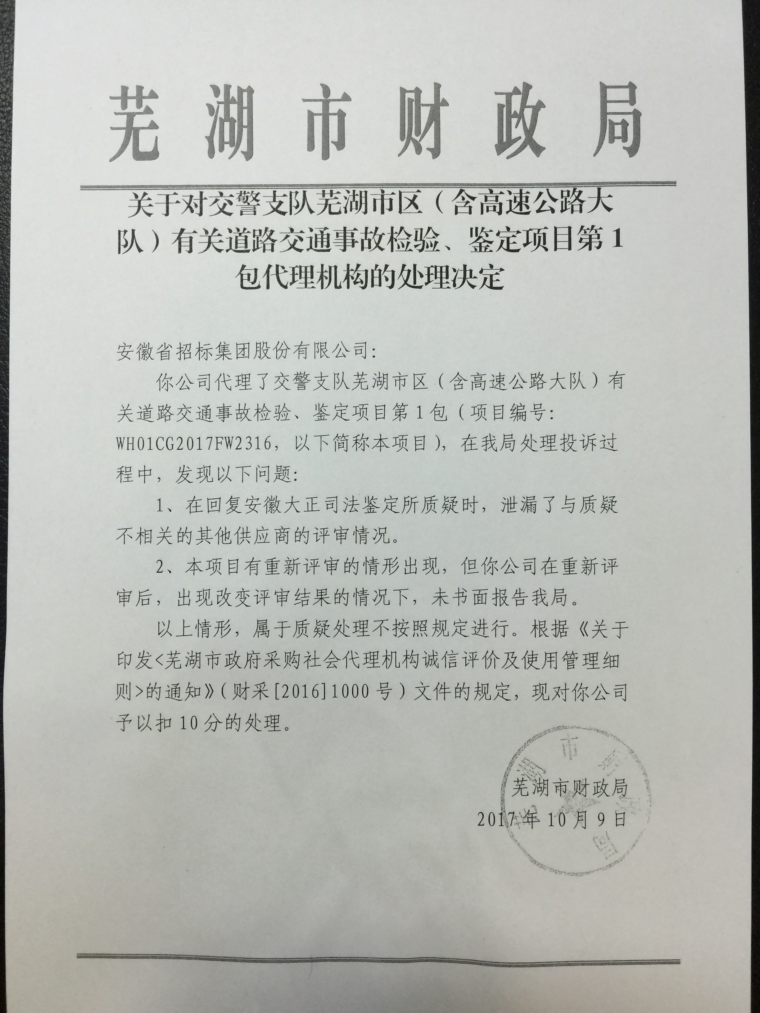 关于对交警支队芜湖市区(含高速公路大队)有关道路交通事故检验、鉴定项目第1包代理机构的处理决定(安徽省招标集团股份有限公司)