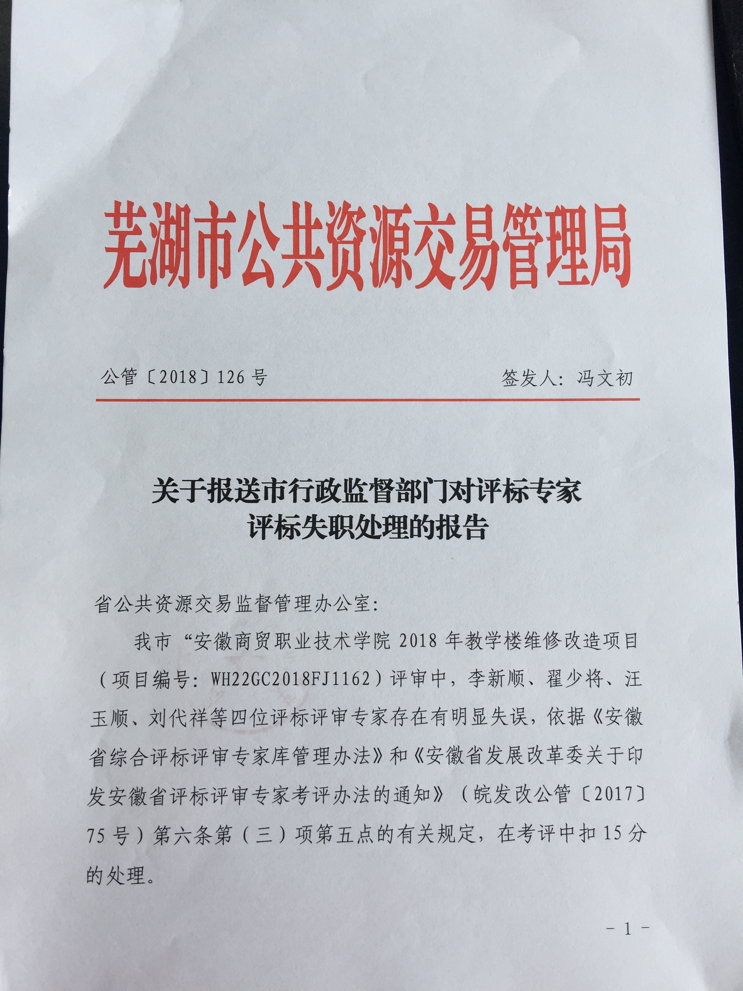 关于对“安徽商贸职业技术学院2018年教学维修改造项目”评标专家的处理决定