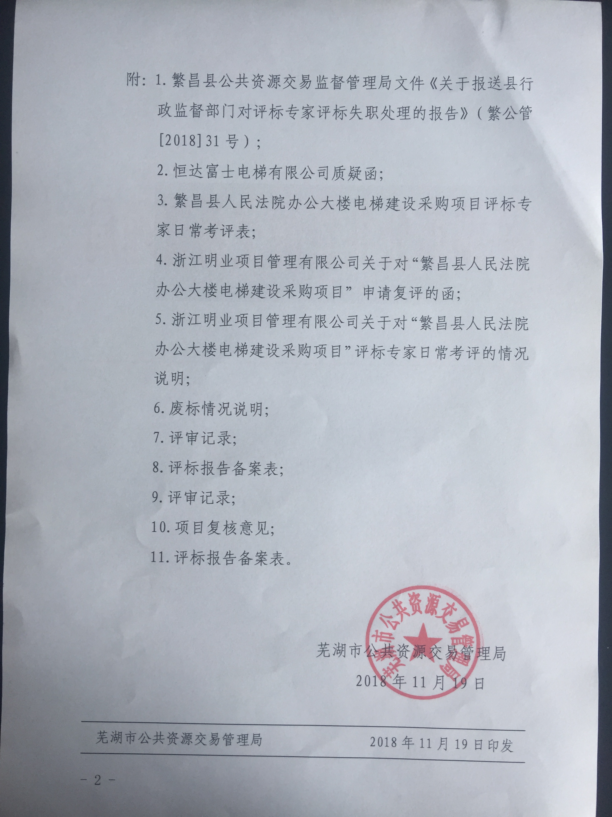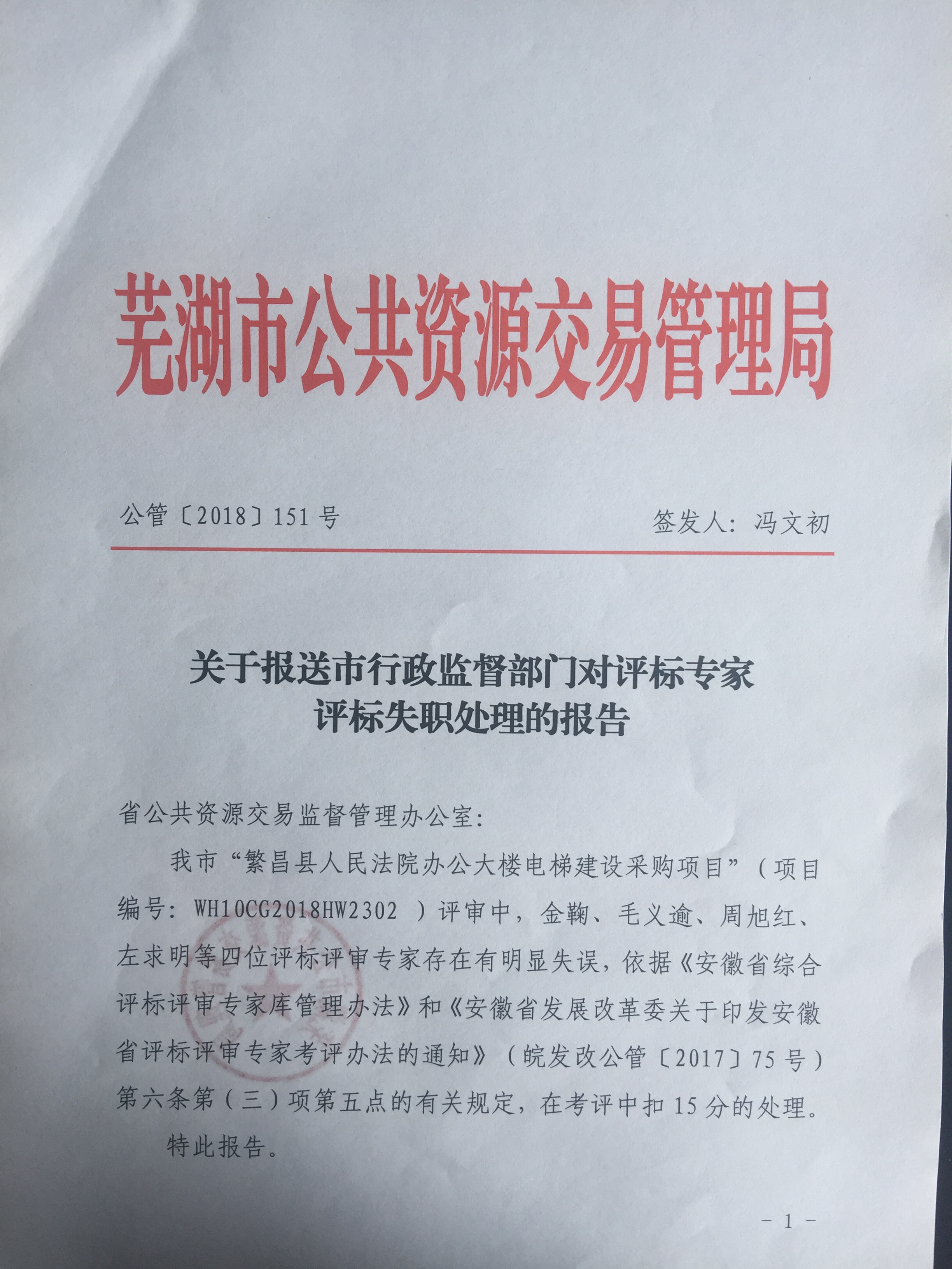 关于对“繁昌县人民法院办公大楼电梯建设采购项目”评标专家的处理