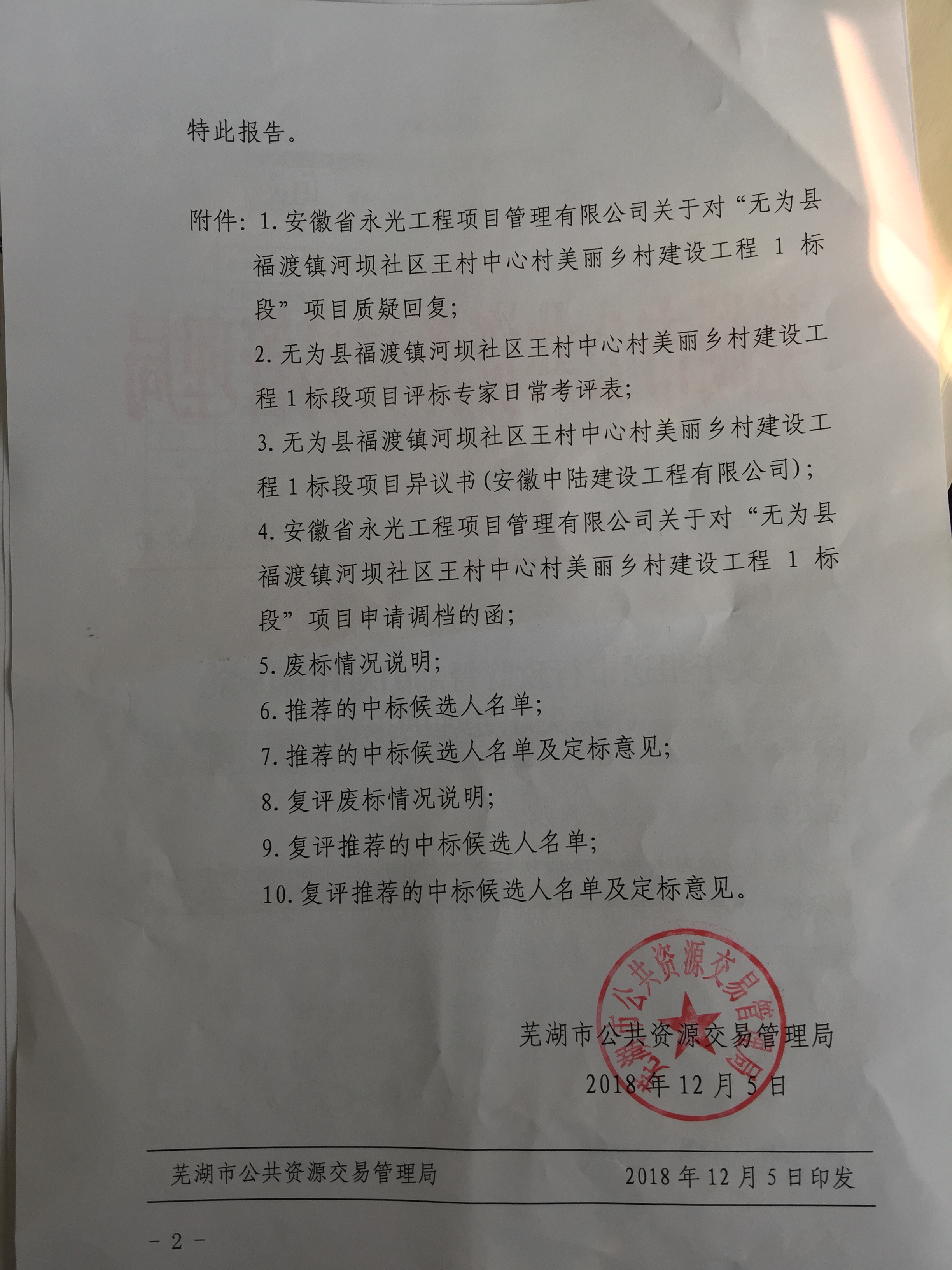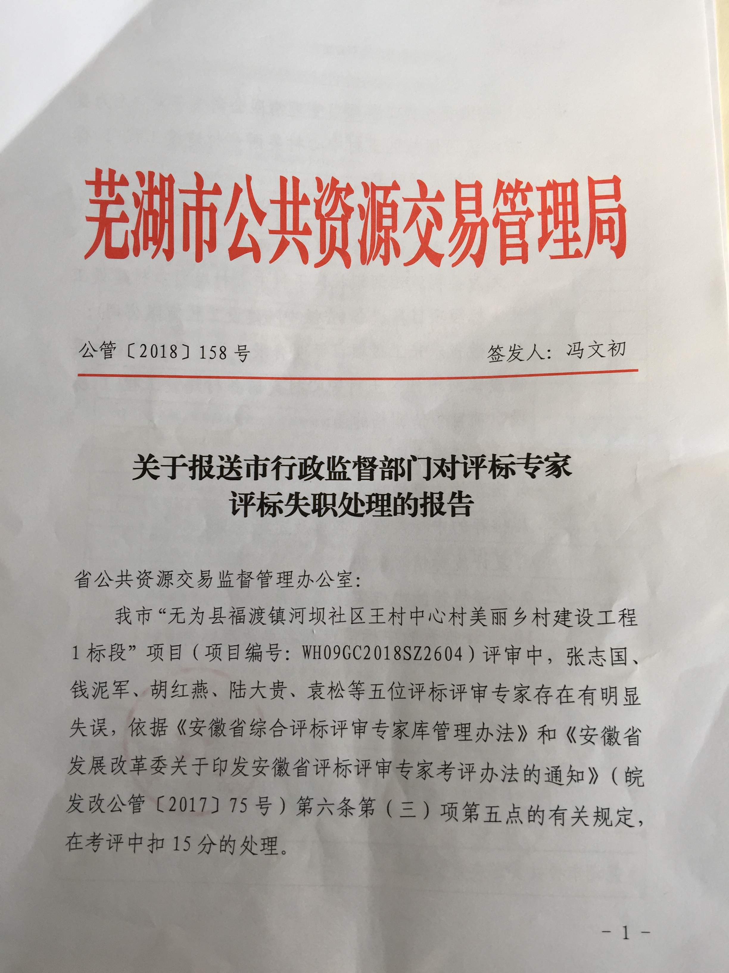 关于对“无为县福渡镇河坝社区王村中心村美丽乡村建设工程1标段”项目评审专家的处理