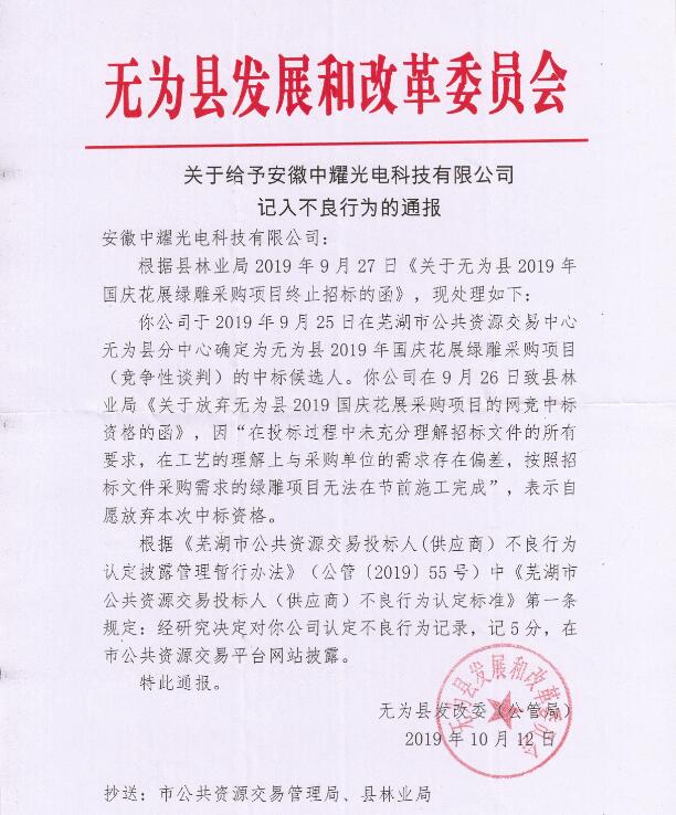 关于给予安徽中耀光电科技有限公司记入不良行为的通报