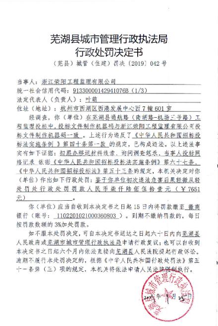 关于对浙江荣阳工程监理有限公司的行政处罚决定书