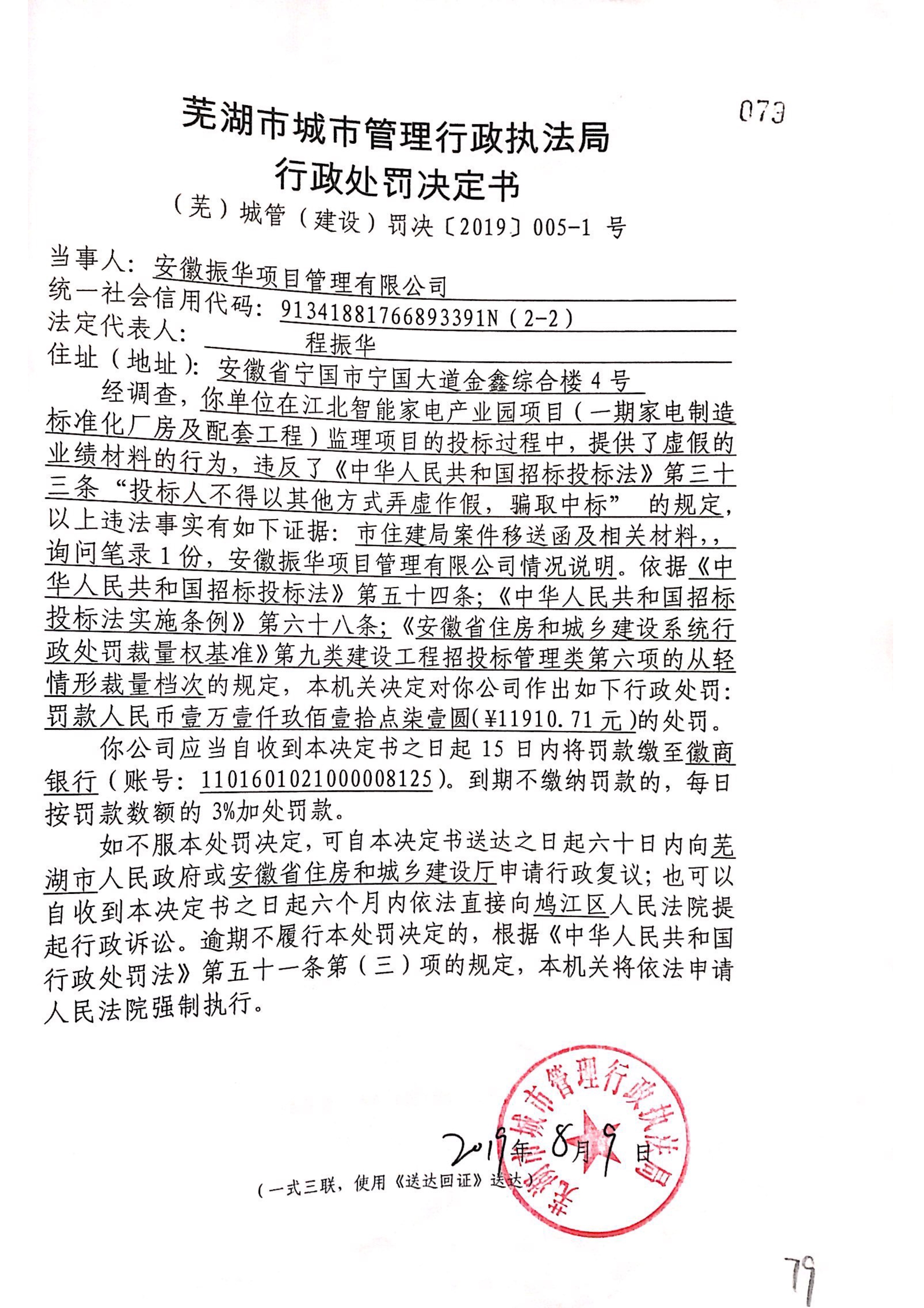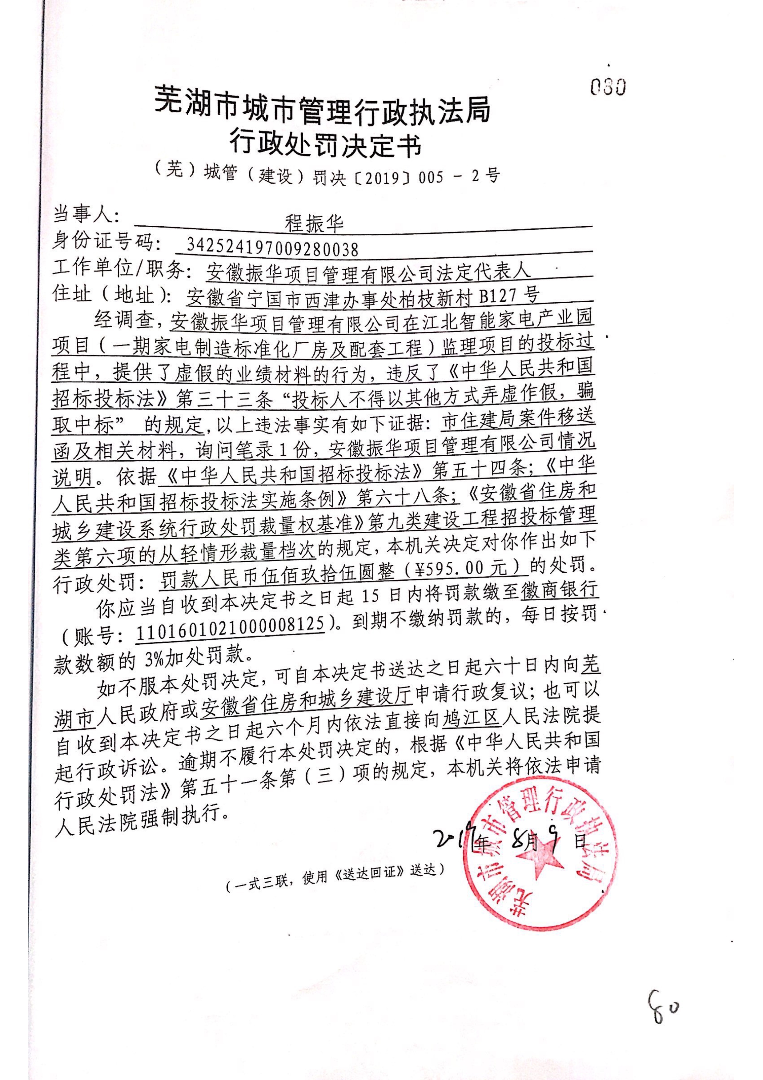 关于对安徽振华项目管理有限公司的行政处罚决定书