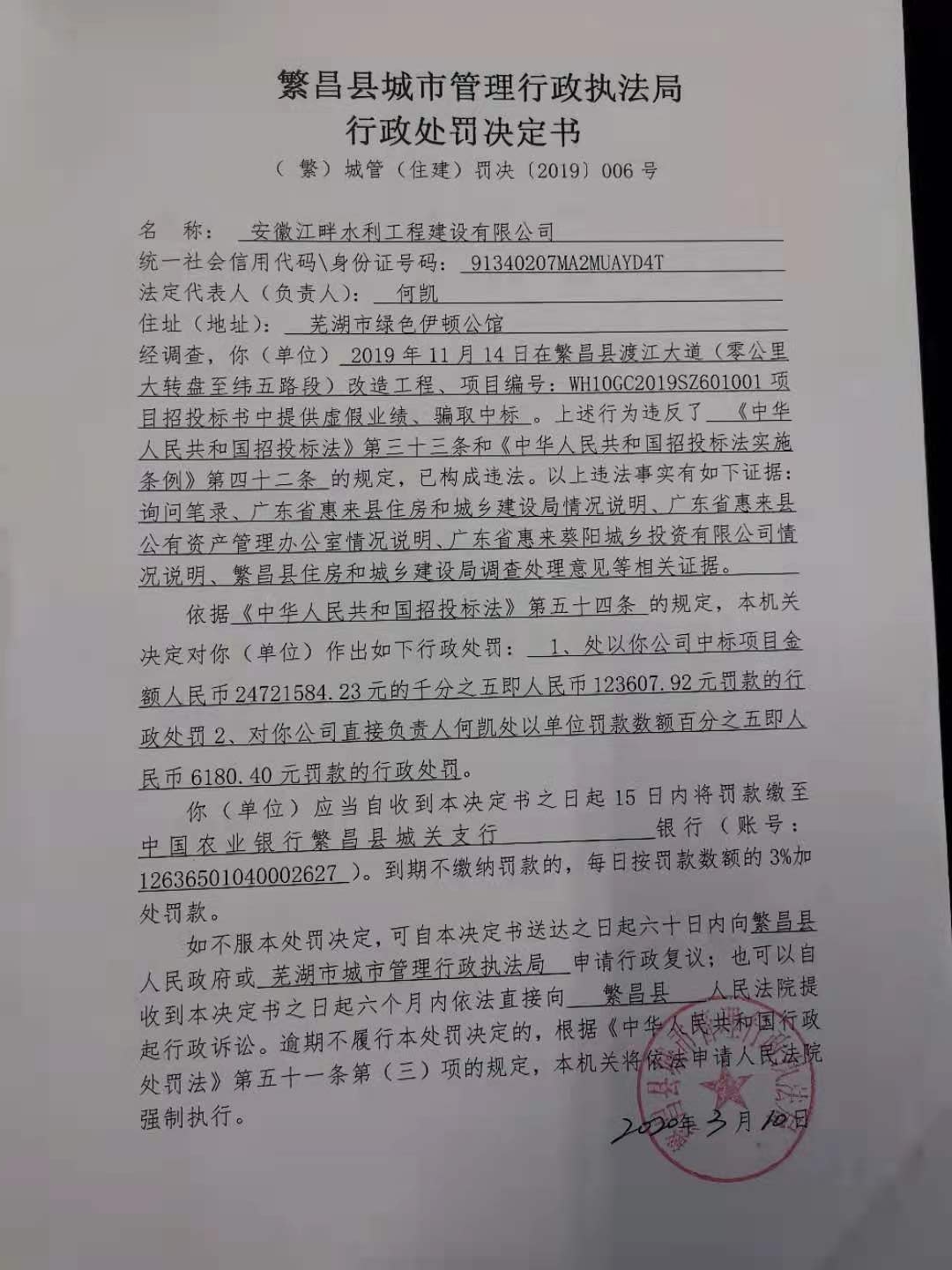行政处罚决定书(安徽江畔水利工程建设有限公司)