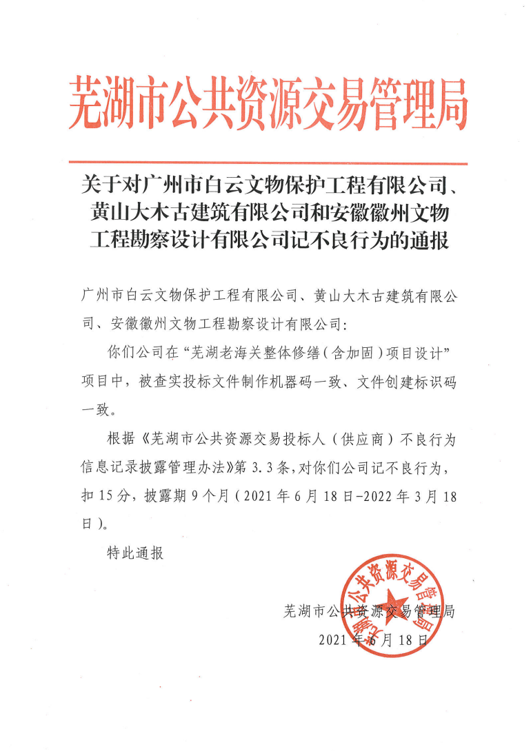 关于对广州市白云文物保护工程有限公司等记不良行为的通报