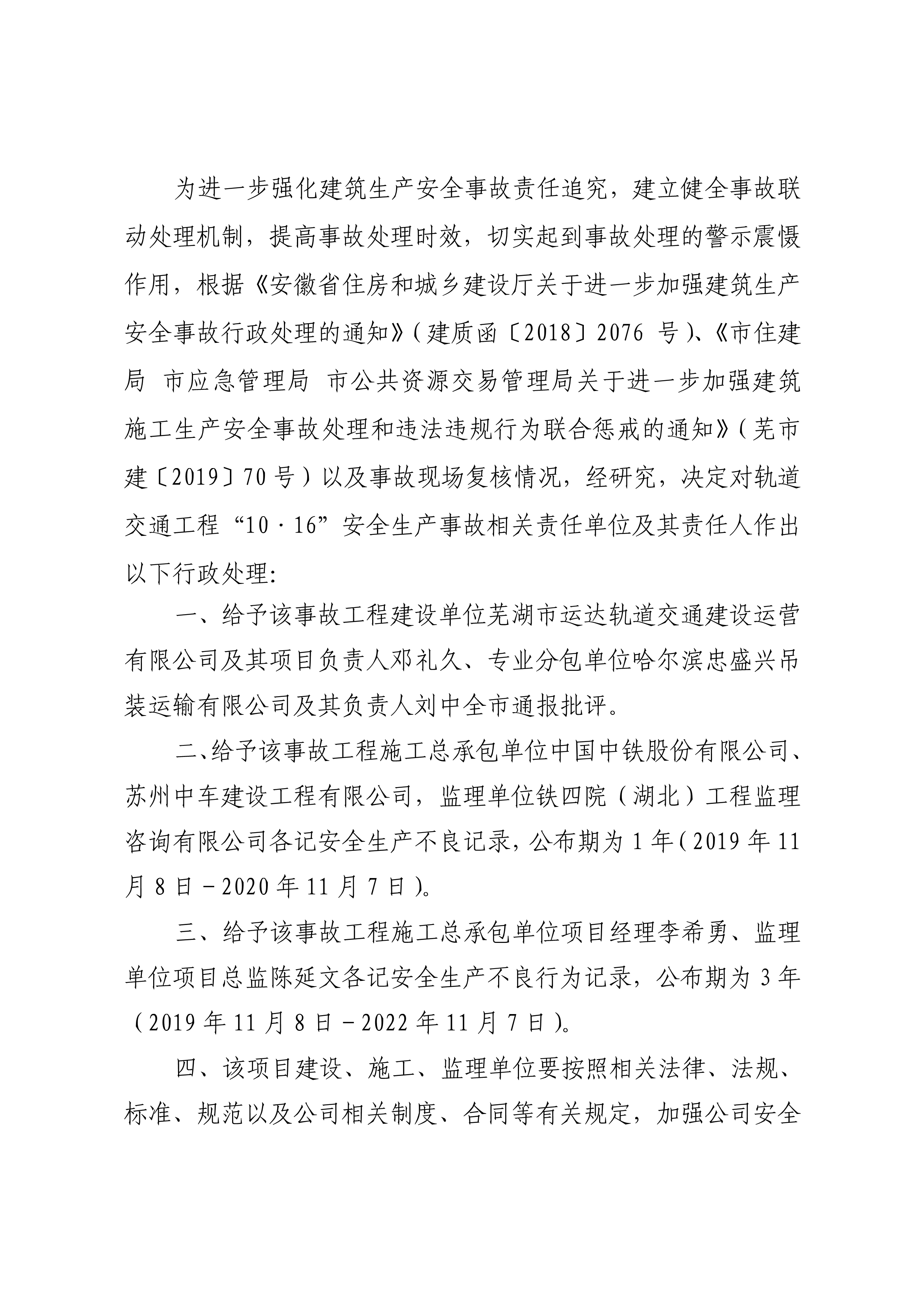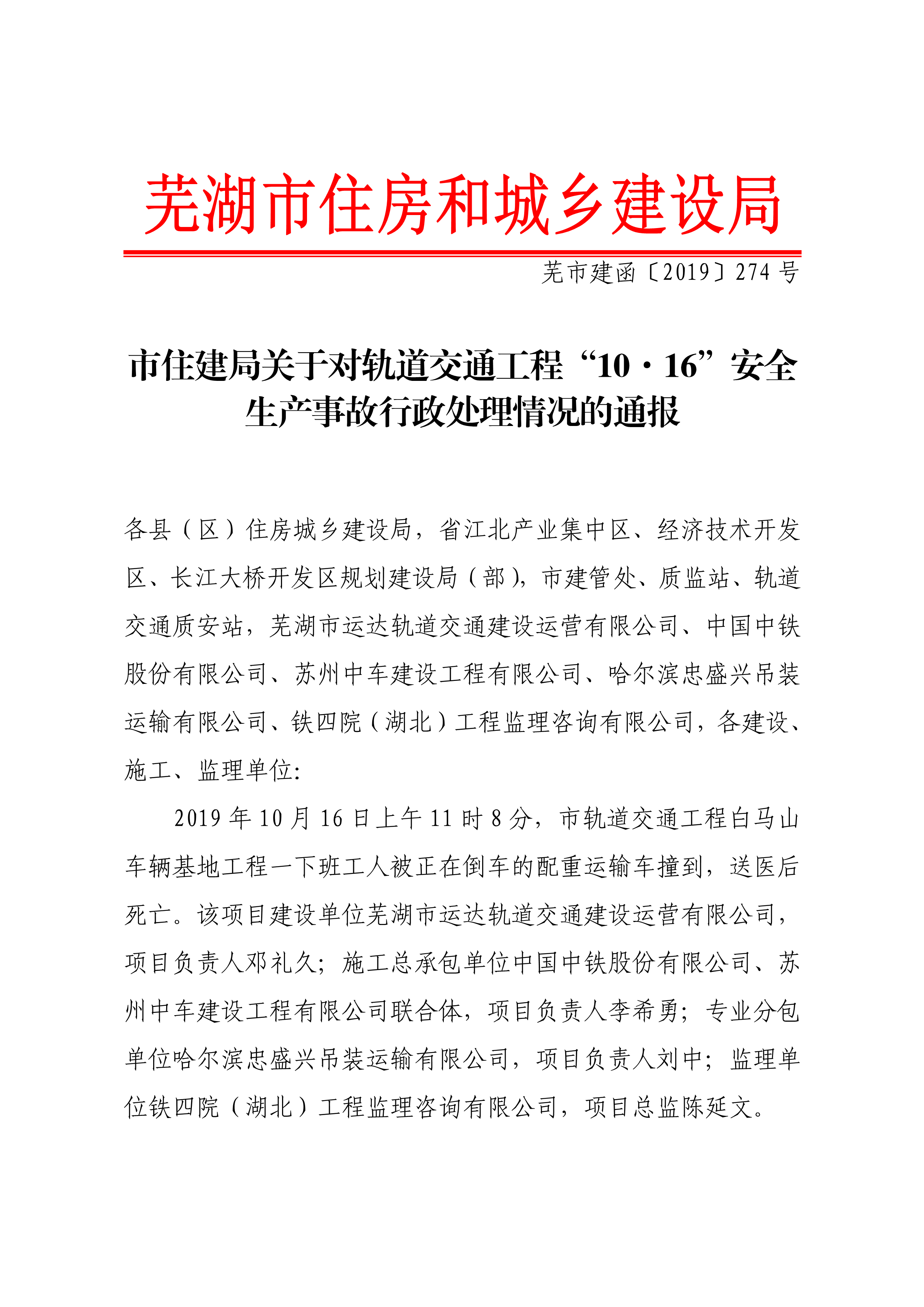 市住建局关于对轨道交通工程“10.16”安全生产事故行政处理情况的通报