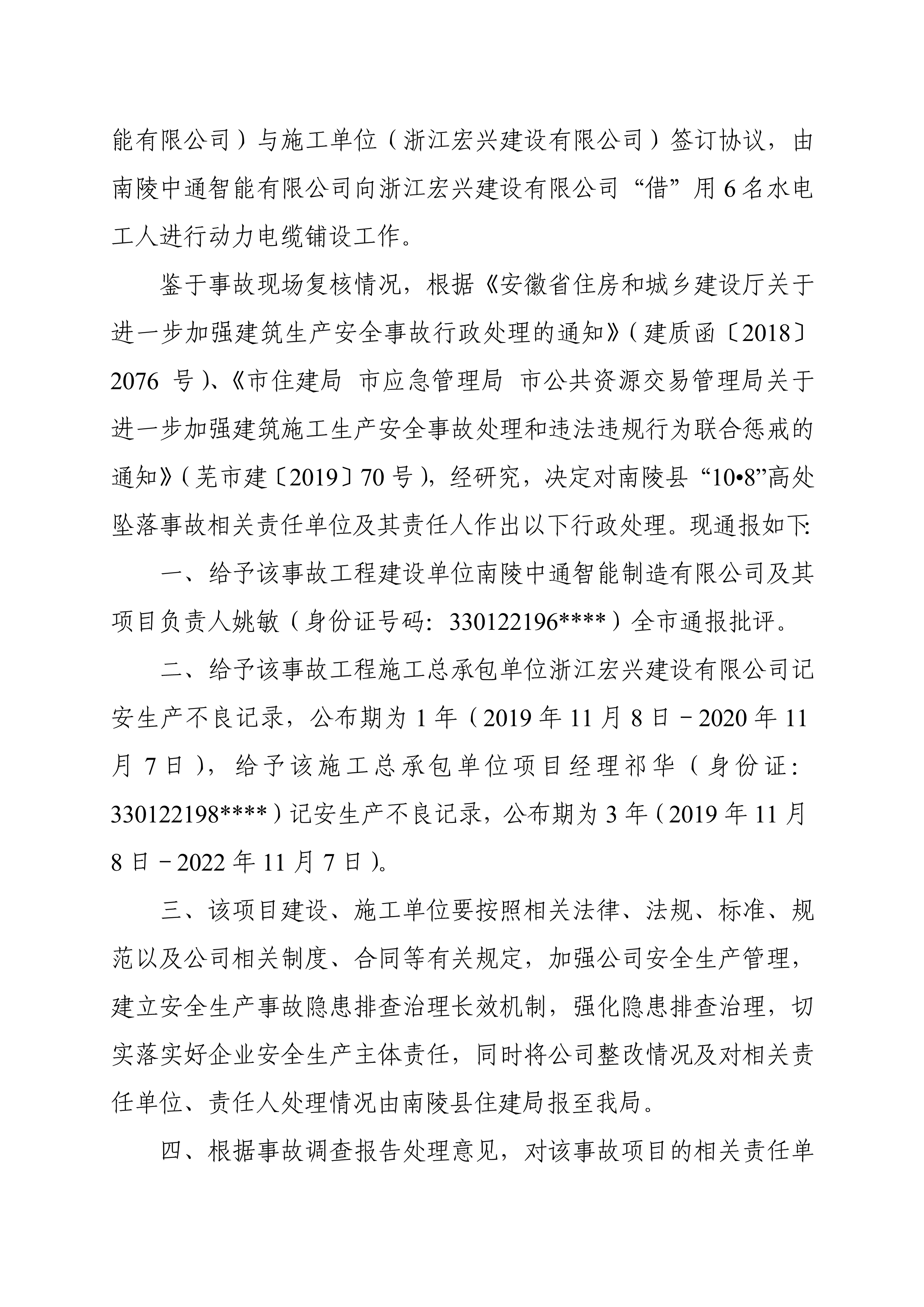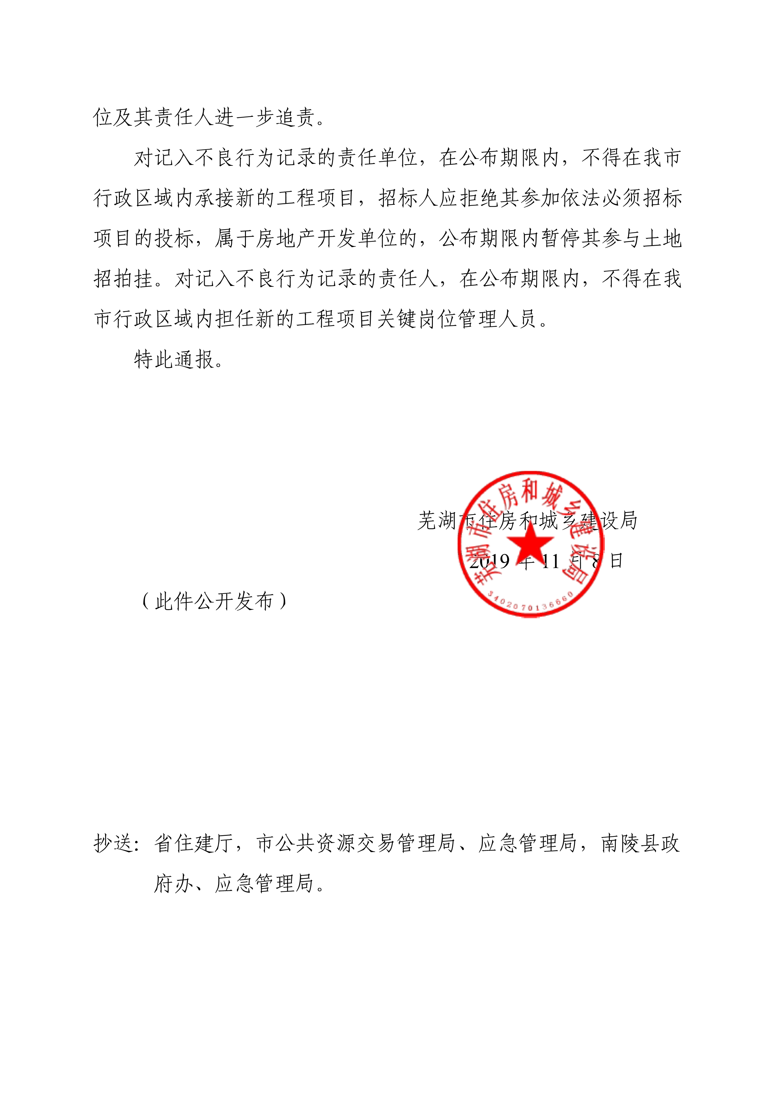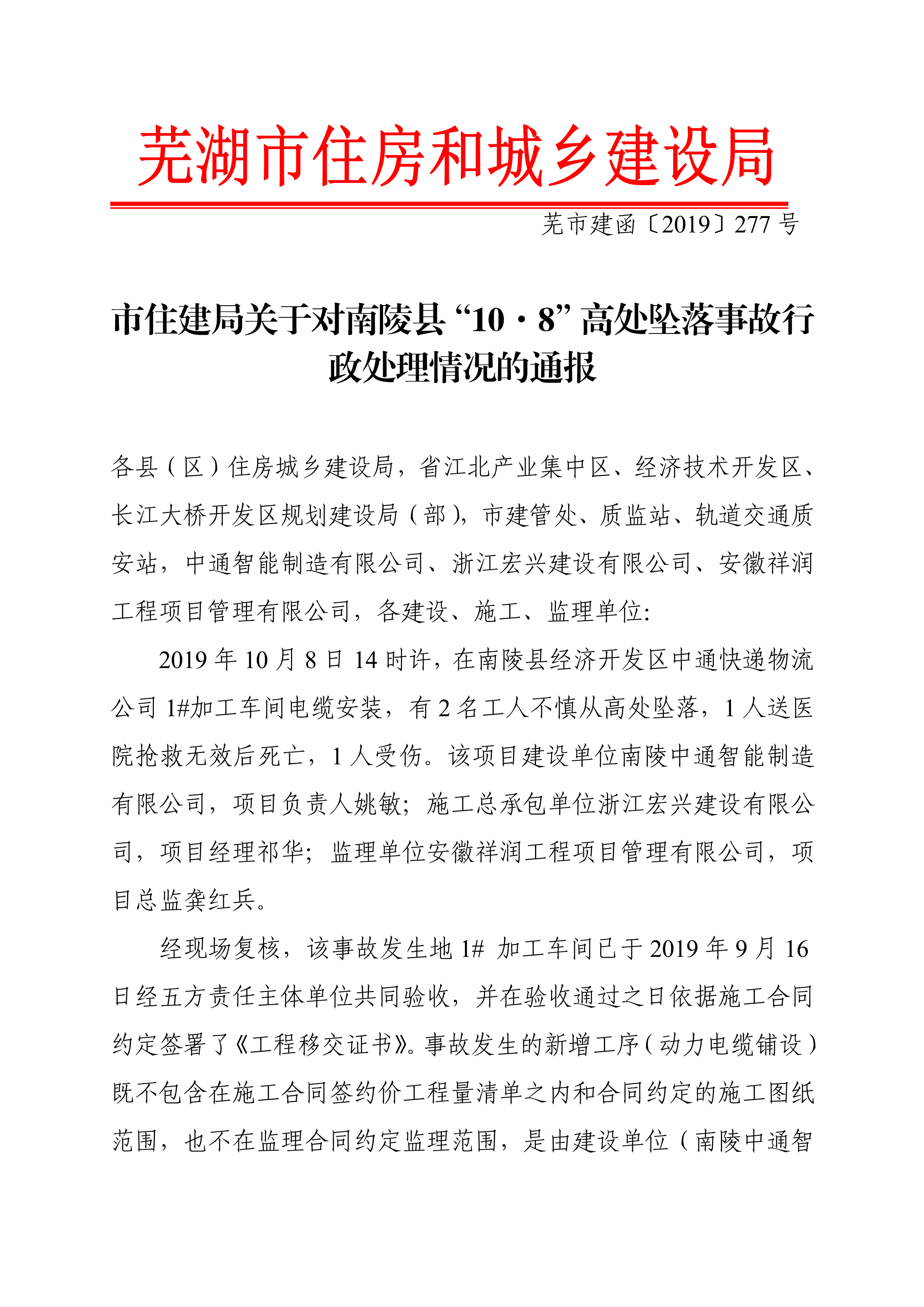 市住建局关于对南陵县“10.8”高处坠落事故行政处理情况的通报