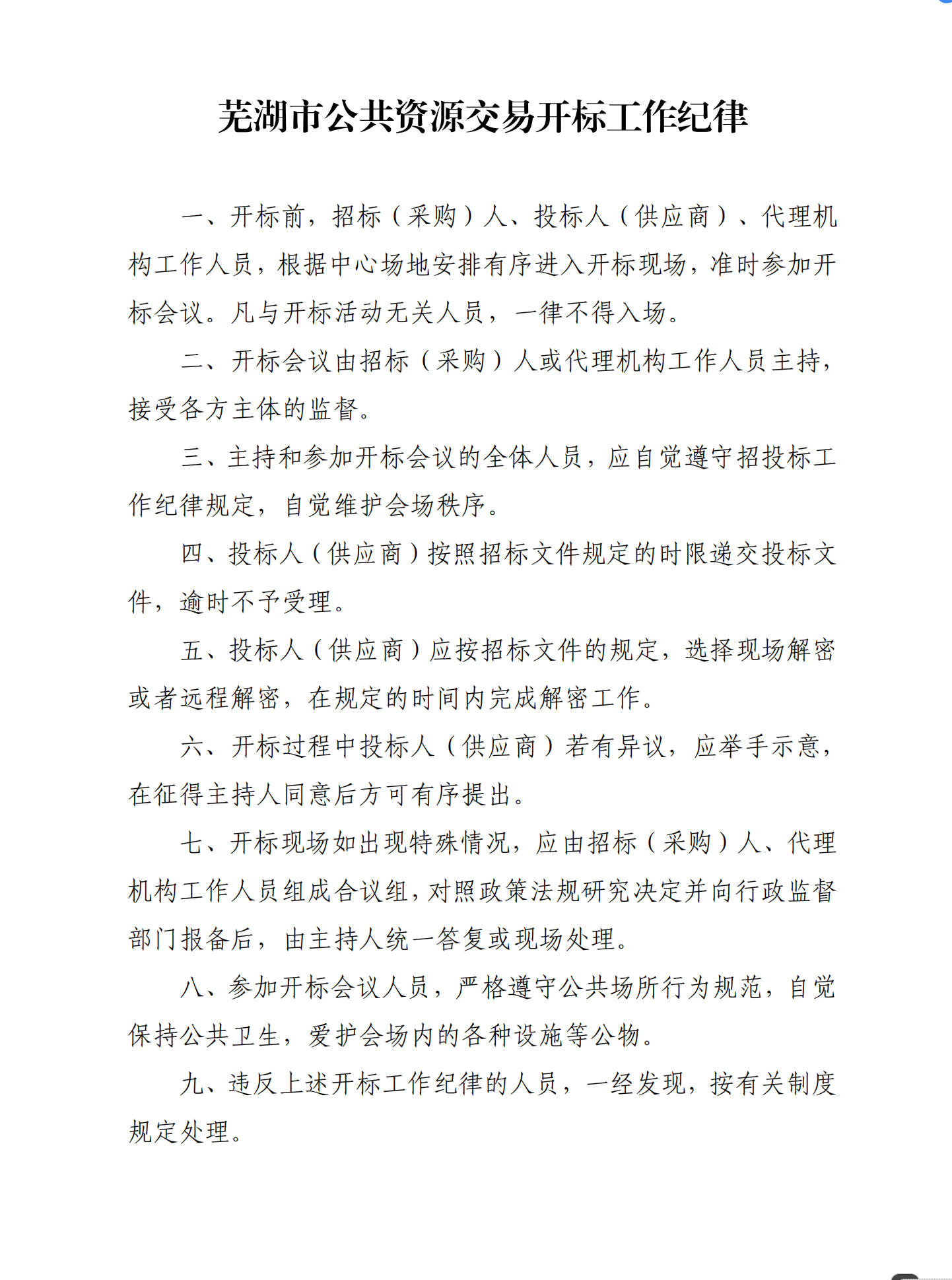 关于印发《芜湖市bet5365亚洲版_mobile365官方网站立即加入_365bet备用器下载交易开标工作纪律》的通知
