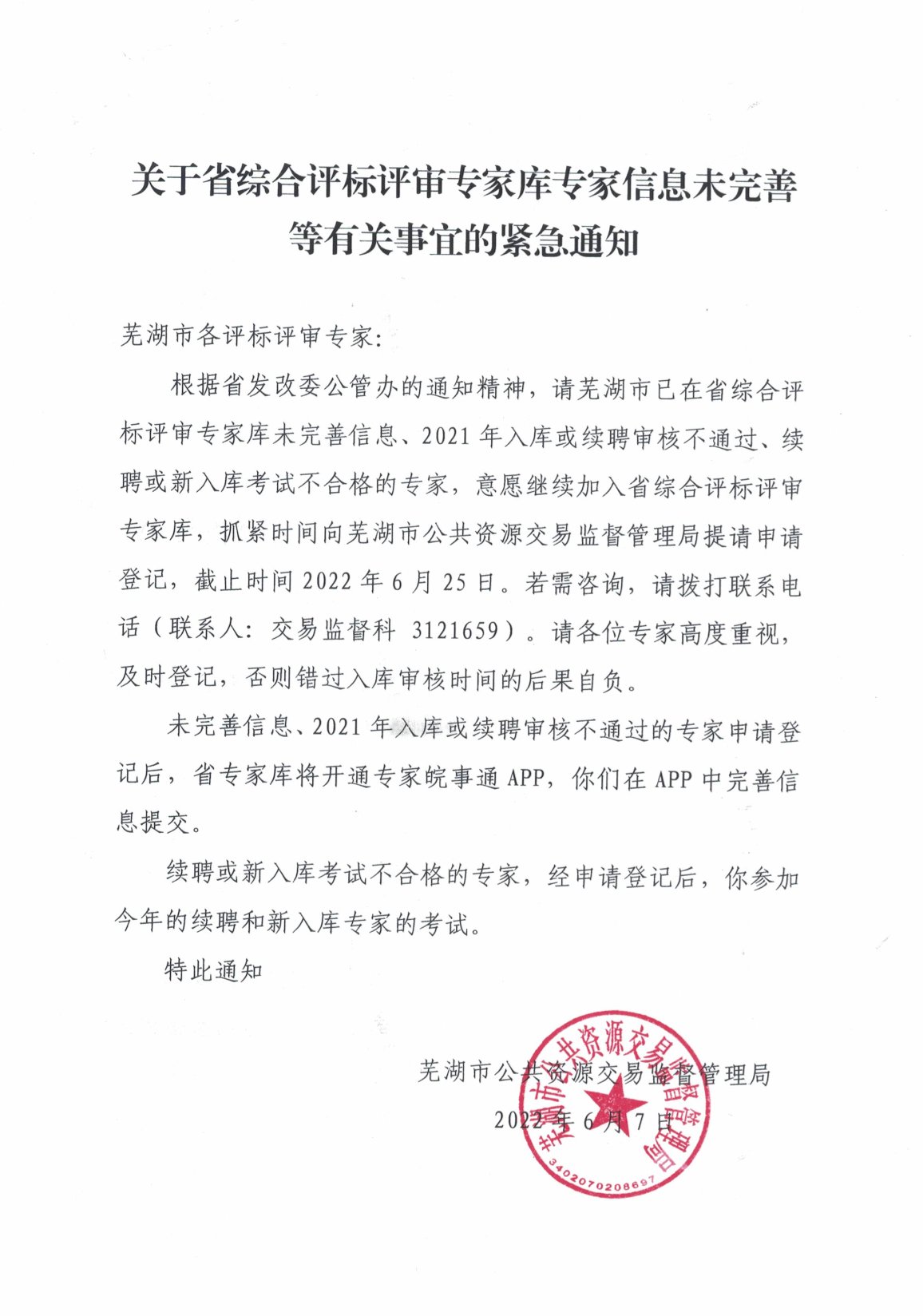 关于省综合评标评审专家库专家信息未完善等有关事宜的紧急通知