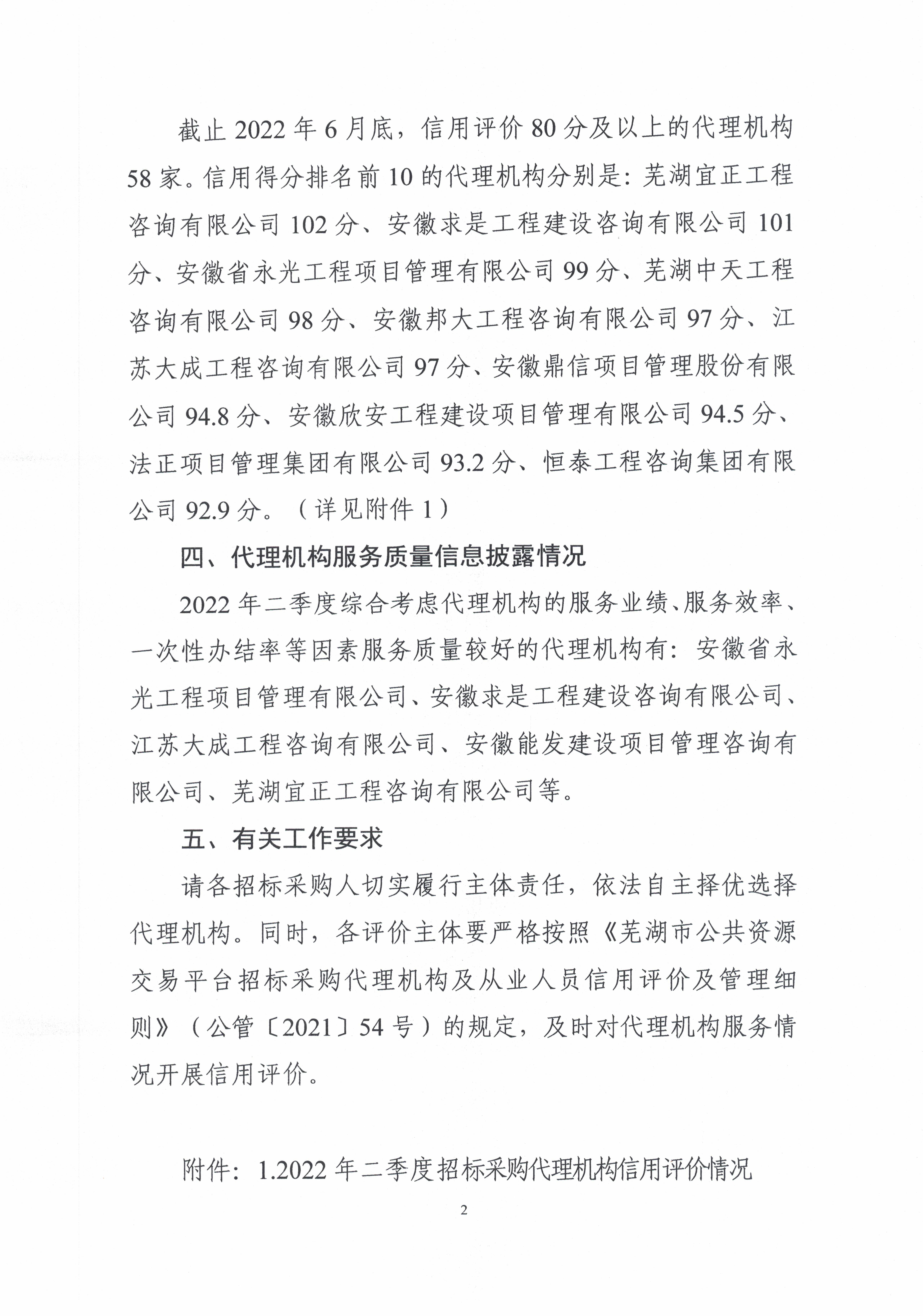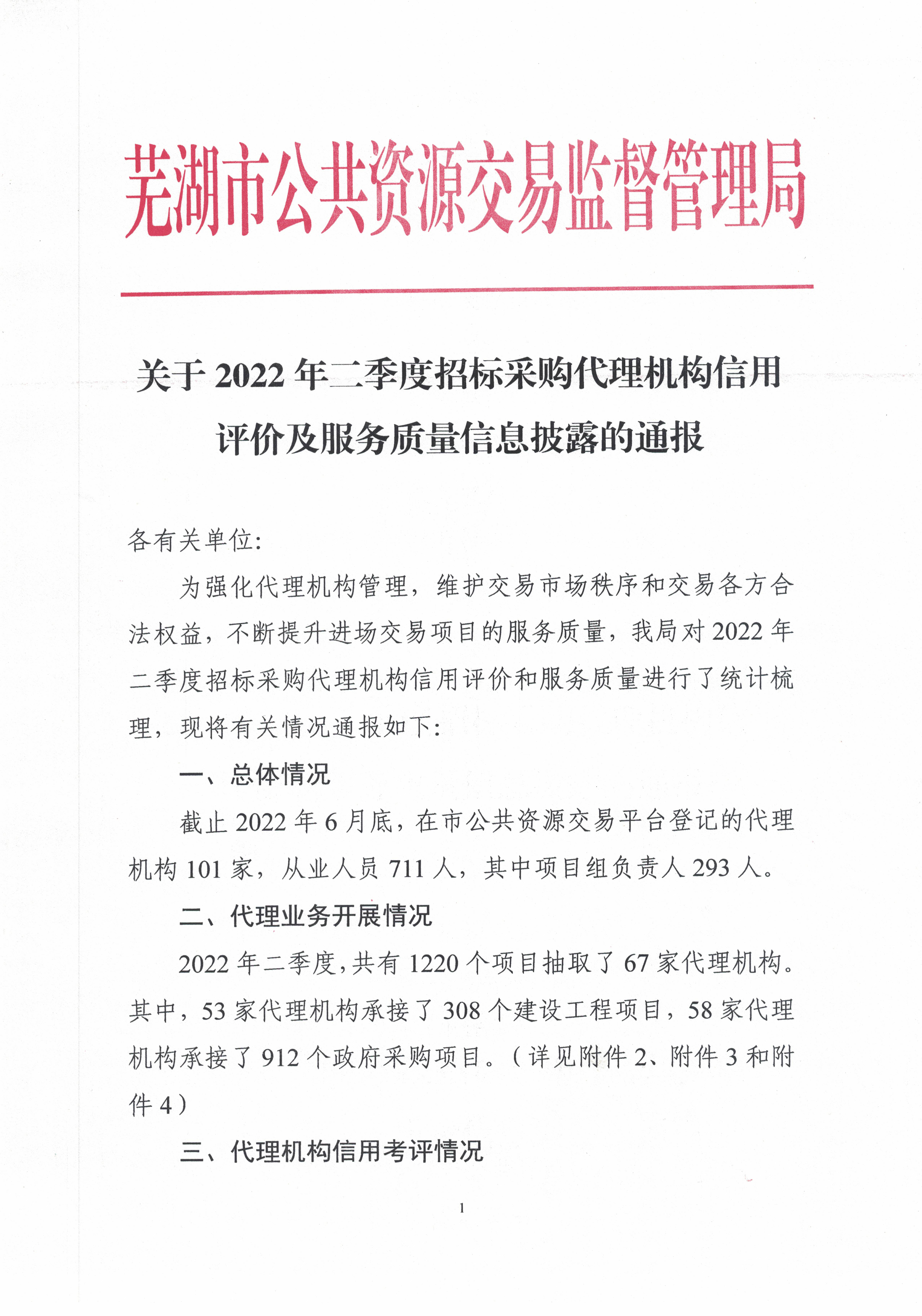 关于2022年二季度招标采购代理机构信用评价及服务质量信息披露的通报