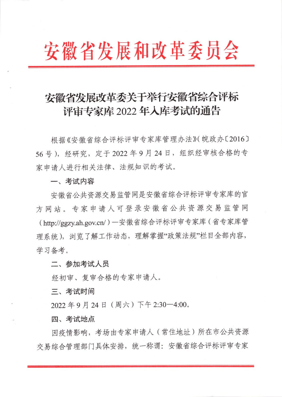 安徽省发展改革委关于举行安徽省综合评标评审专家库2022年入库考试的通告