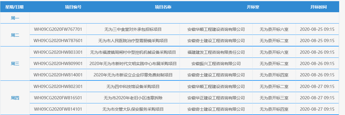 无为市项目一周安排表(2020年8月24日-2020年8月28日)