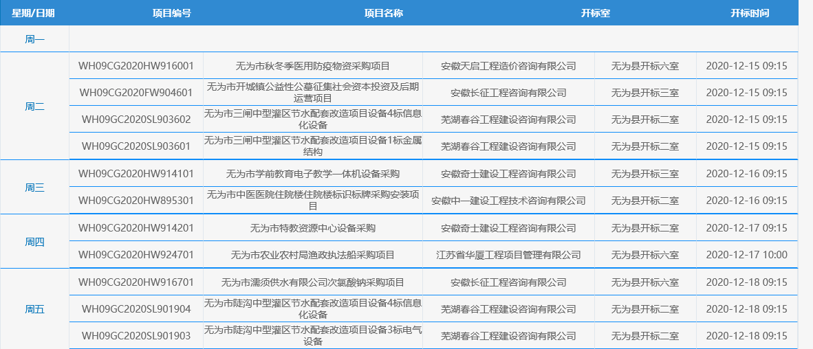 无为市项目一周安排表(2020年12月14日-2020年12月18日)