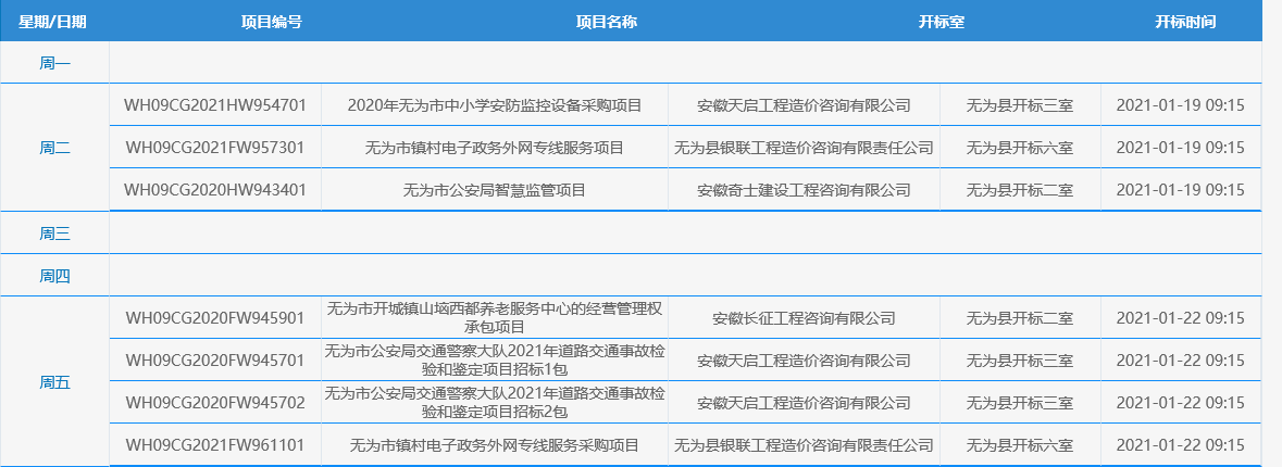 无为市项目一周安排表(2021年1月18日-2021年1月22日)