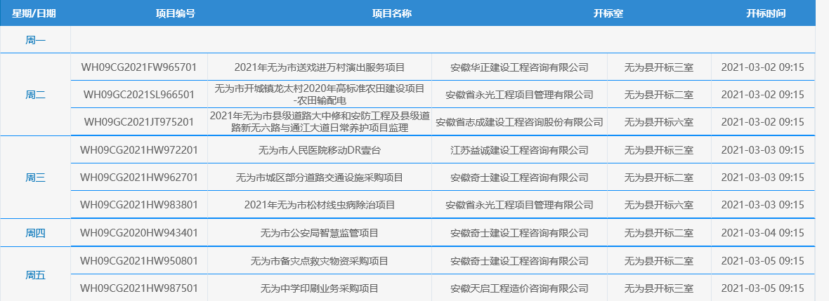 无为市项目一周安排表(2021年3月1日-2021年3月5日)