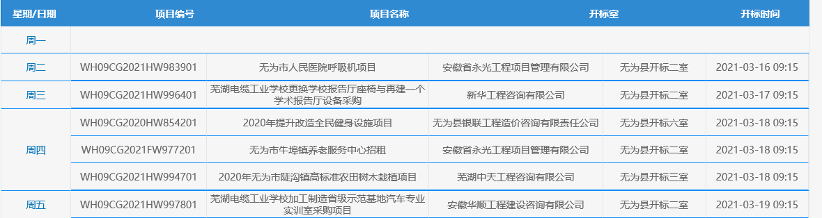 无为市项目一周安排表(2021年3月15日-2021年3月19日)