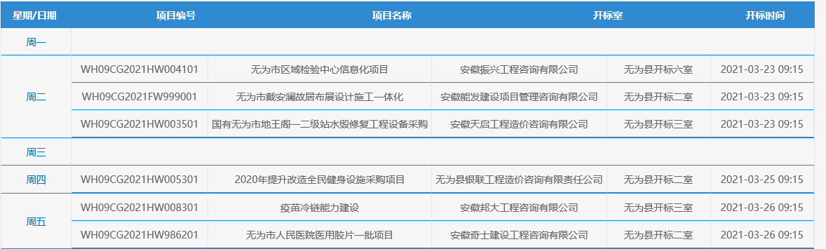 无为市项目一周安排表(2021年3月22日-2021年3月26日)